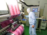 プラスチック表面に金属層を形成させる真空蒸着工程を連続して行う、世界唯一の革新的な設備です。インラインコートの設備も完備し、基材の種類、厚薄を問わず加工可能。大手食品メーカーをはじめ、写真感材メーカーへの採用事例も多く、高い信頼を獲得しています。汎用フィルムへの加工など、現在も開発中の商品が多く、今後の活躍が期待ができます。